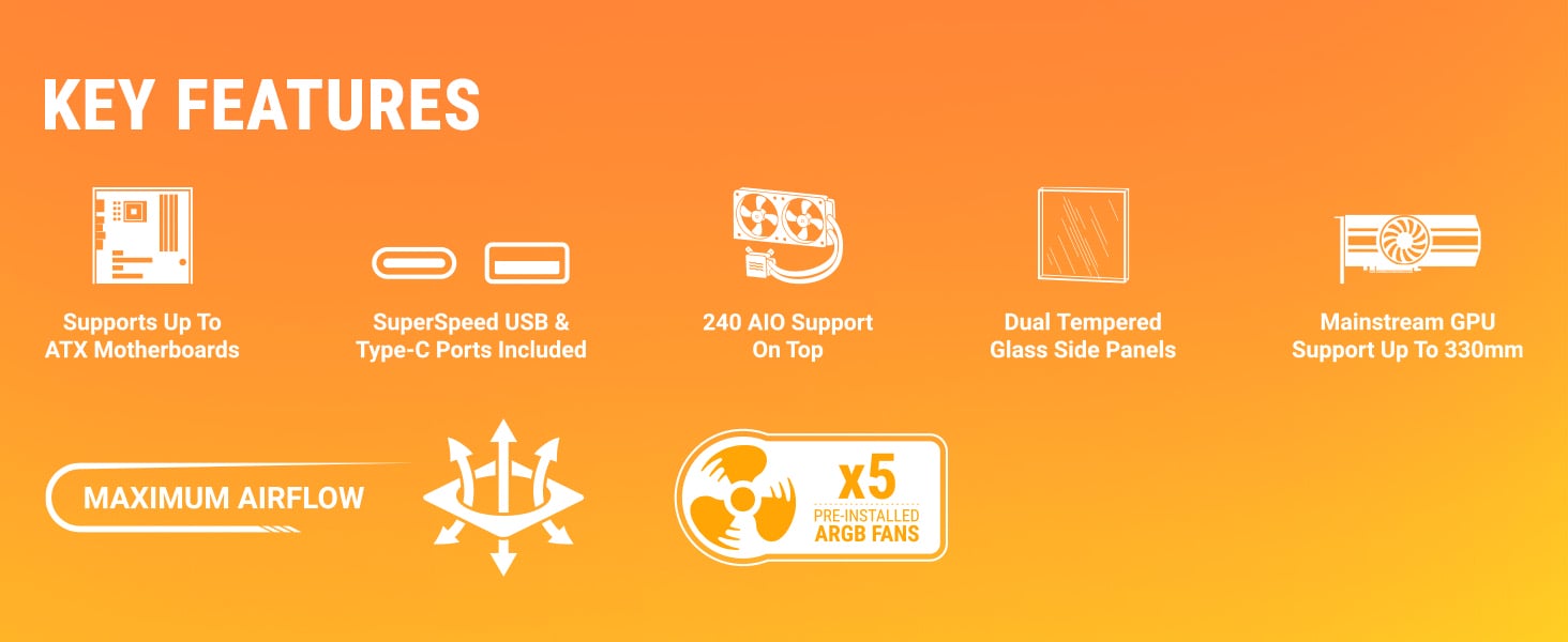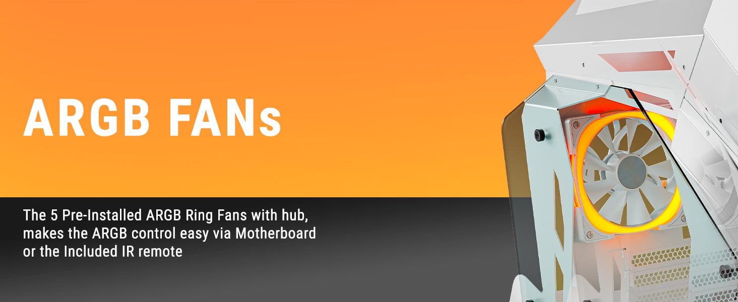 - Included 5 x 120mm ARGB Ring Fans – The chassis comes pre-installed with five 120mm ARGB ring fans, providing powerful airflow while adding customizable lighting effects, allowing you to create a visually stunning and well-cooled setup.