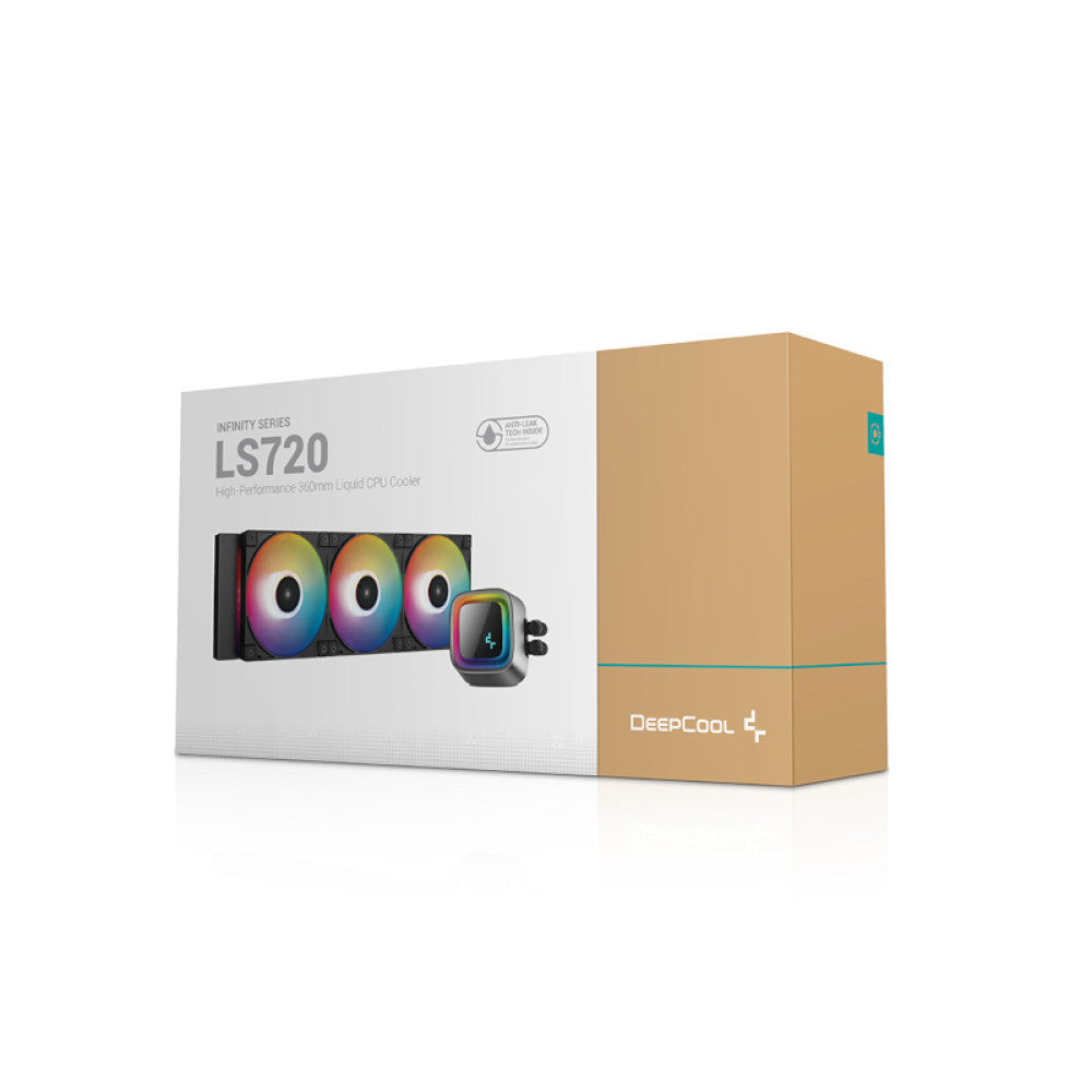 The DeepCool LS720 premium liquid CPU cooler maximizes cooling performance and low-noise efficiency with a 360mm radiator, three FC120 A-RGB PWM fans, and an infinity mirror cap design.